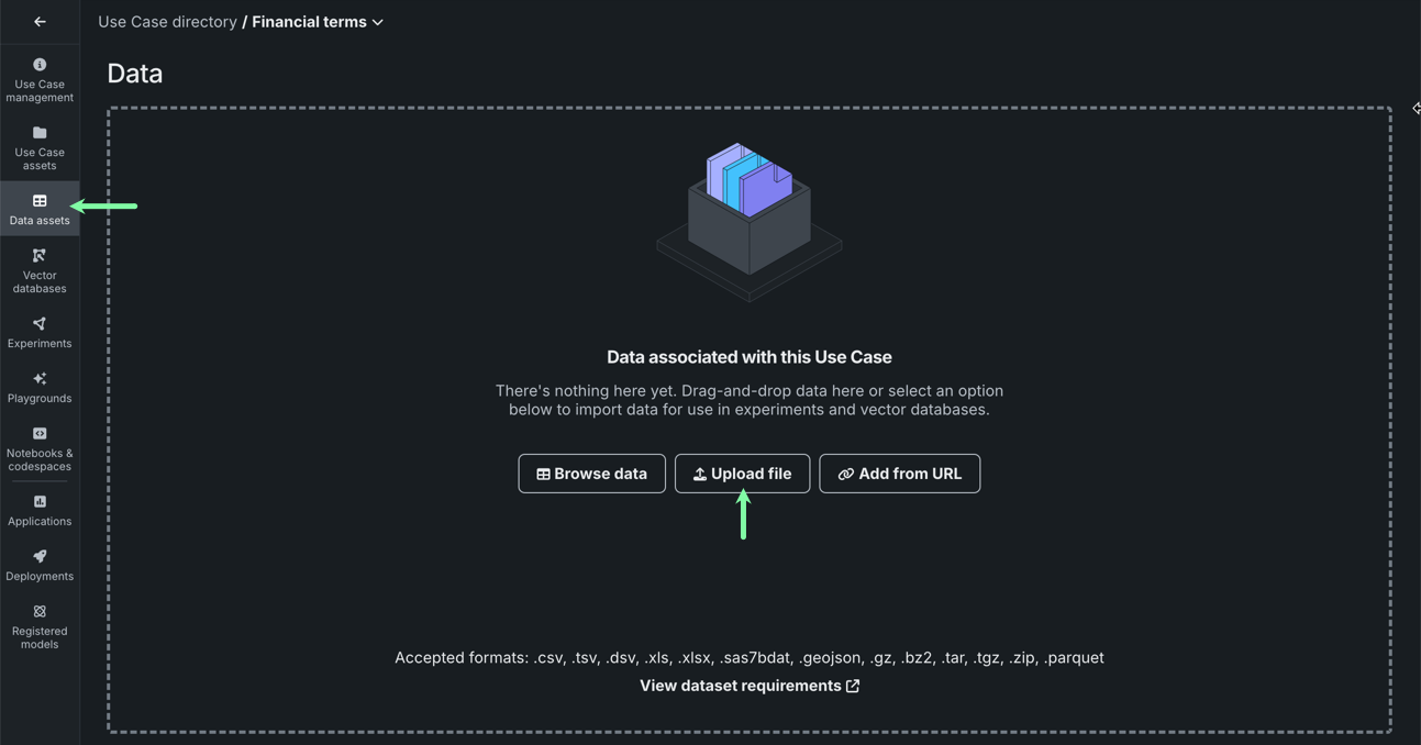 In the left-hand navigation, click the Data assets tile and click Upload file. Then, select the .zip file saved to your computer.