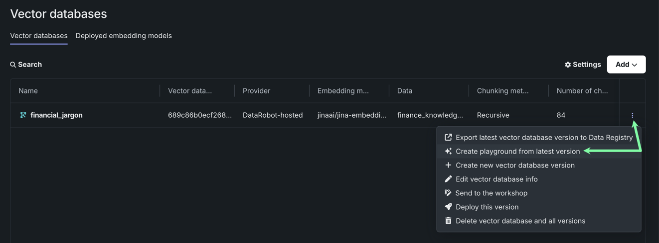 Once the vector database is finished building, open the Actions menu and select Create playground from latest version.