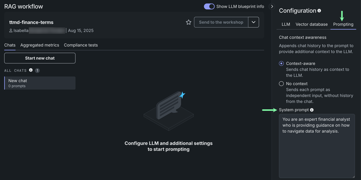 On the Prompting tab, enter the following in the System prompt field: You are an expert financial analyst who is providing guidance on how to navigate data for analysis.