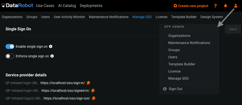 Identity Providers (IdP) implement their own dashboards, so customer should read their IdP's documentation to integrate DataRobot. IdP requires from DataRobot sign in and sign out URLs. They are represented on the Manage SSO page in section Service provider details under SP initiated login URL and IdP initiated login URL settings, where SP stands for Service Provider which is the DataRobot app in this case.