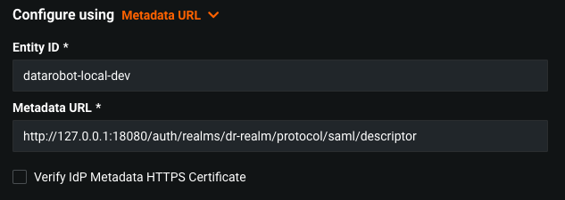 Entity Id- Unique identifier. Provided by Identity Provider.Metadata URL- URL to the XML document with information required for integration with IdP.Verify IdP Metadata HTTPS Certificate- If this is checked and the Metadata URL is of HTTPS schema, then it is checked for a valid certificate.