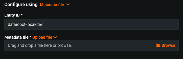 Entity Id- Unique identifier. Provided by Identity Provider.Metadata file- IdP Metadata content as XML document. User has to retrieve this content from corresponding IdP. This option should be used when there is no way to have IdP Metadata URL.