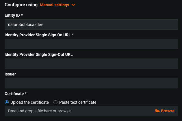 Entity Id- Unique identifier. Provided by Identity Provider.Identity Provider Single Sign On URL- The URL that DataRobot contacts to initiate login authentication for the user. This is obtained from the SAML application you created for DataRobot in the IdP configuration.Identity Provider Single Sign-Out URL (optional)- The URL that DataRobot directs the user’s browser to after logout. This is obtained from the SAML application you created for DataRobot in the IdP configuration. If left blank, DatRobot redirects to the root DataRobot site.Issuer- The IdP-provided Entity ID obtained from the SAML application you created for DataRobot in the IdP configurationCertificate- IdP X.509 certificate, pasted or uploaded. The certificate is obtained from the IdP side. The certificate is used by SP for verifying the IdP signatures.