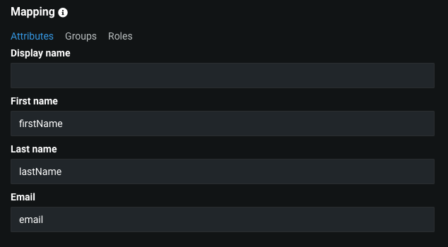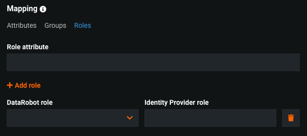 There are three mapping options: Attributes, Groups, Roles. All three options allow the system administrator to set up user attributes/groups/roles mappings between the Identity Provider and DataRobot. Those mappings are used during automatic user provisioning.