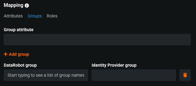 To configure, set: * Group attribute: The name, in the SAML response, that identifies the string as a group name. * DataRobot group: The name of an existing DataRobot group to which the user will be assigned. * Identity provider group: The name of the IdP group to which the user belongs.