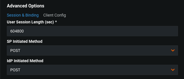 User Session Length (sec)- Session cookie expiration time.SP Initiated Method- SAML method which is used to start authentication negotiation.IdP Initiated Method- SAML method which is used to move user to DataRobot after successful authentication.