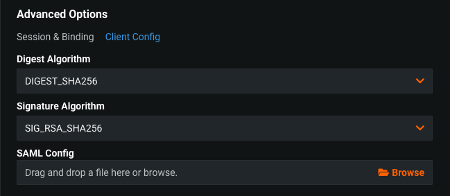 Create and upload a JSON file using SAML Config described in the Advanced Options / Client Config / SAML Config section above.