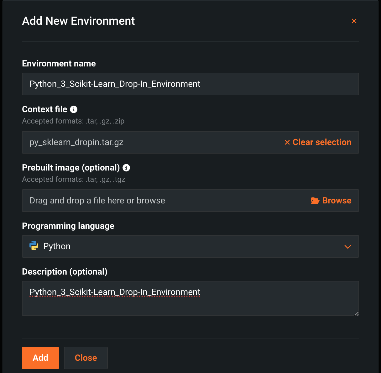 .tar.gztarball. From your terminal, run thetarcommand to create the tarball. Replace/path/to/with the actual path where you cloned the repository.tar -czvf py_dropin.tar.gz -C /path/to/datarobot-user-models/public_dropin_environments/python3_sklearn/ . -