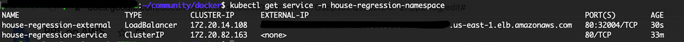 exposecommand to generate a Kubernetes service for the deployment.kubectl expose deployment house-regression-deployment -n house-regression-namespace --name=house-regression-external --type=LoadBalancer --port 80 --target-port 8080--portis the port number configured on the Load Balancer.--target-portis the port number that the deployment container is listening on.