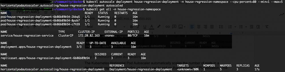 kubectl get all -n house-regression-namespaceHorizontal Pod Autoscaler appears in the resources list.