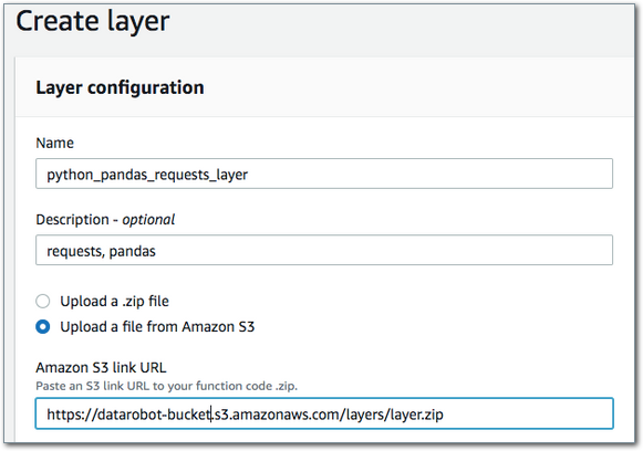 aws s3 cp layer.zip s3://datarobot-bucket/layers/layer.zip