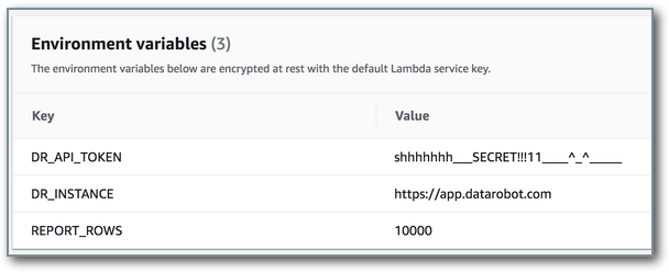 3. The related deployment in DataRobot is specified in the S3 bucket path name to the CSV file, so the Lambda works generically for any deployment.