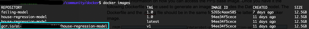 docker imagescommand to verify that the build was successful:The generated image contains the DataRobot model and the monitoring agent used to transfer the service and model health metrics back to the DataRobot MLOps platform.