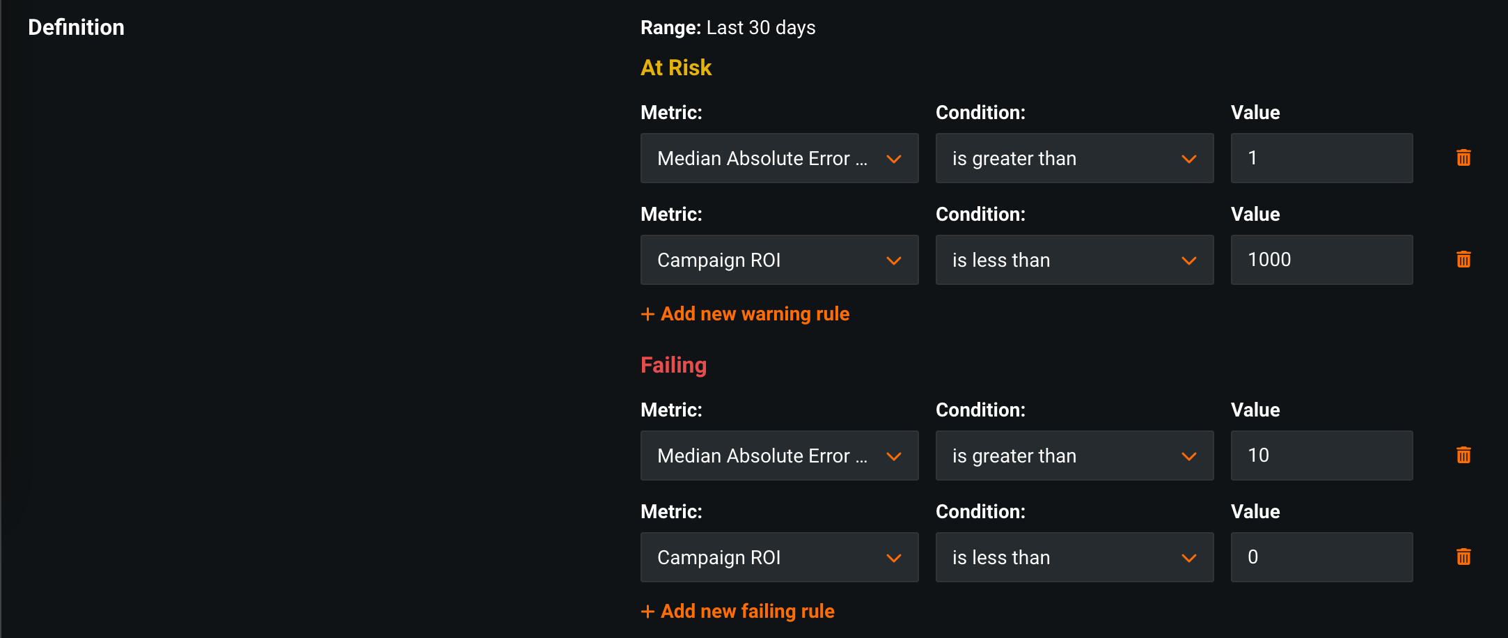 In the Definition section, define logical statements for any of your custom metrics' At Risk and Failing thresholds: