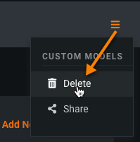 There are several Actions available from the menu on the Model Registry > Custom Model Workshop page, such as sharing and deleting custom models or environments.
