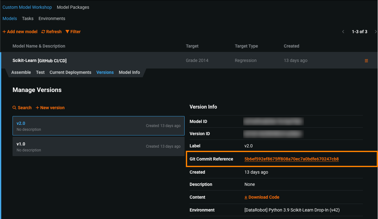 After your workflow creates a model and a deployment in DataRobot, you can access the commit information from the model's version info and the deployment's overview: