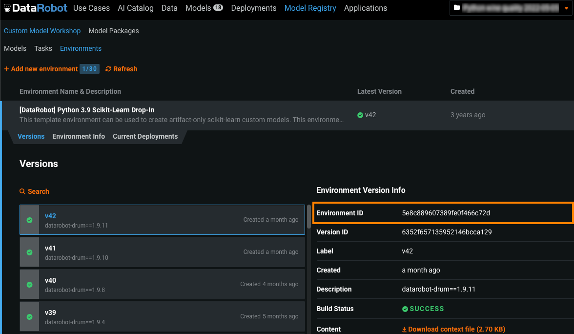 model_environment_id: Provide the DataRobot execution environment required for your custom model. You can find these environments in the DataRobot application under Model Registry > Custom Model Workshop > Environments.