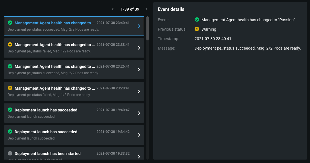 To view an overview of deployment events, select the deployment from the inventory and navigate to the Service Health tab. All events are recorded under the Recent Activity > Agent Activity section: