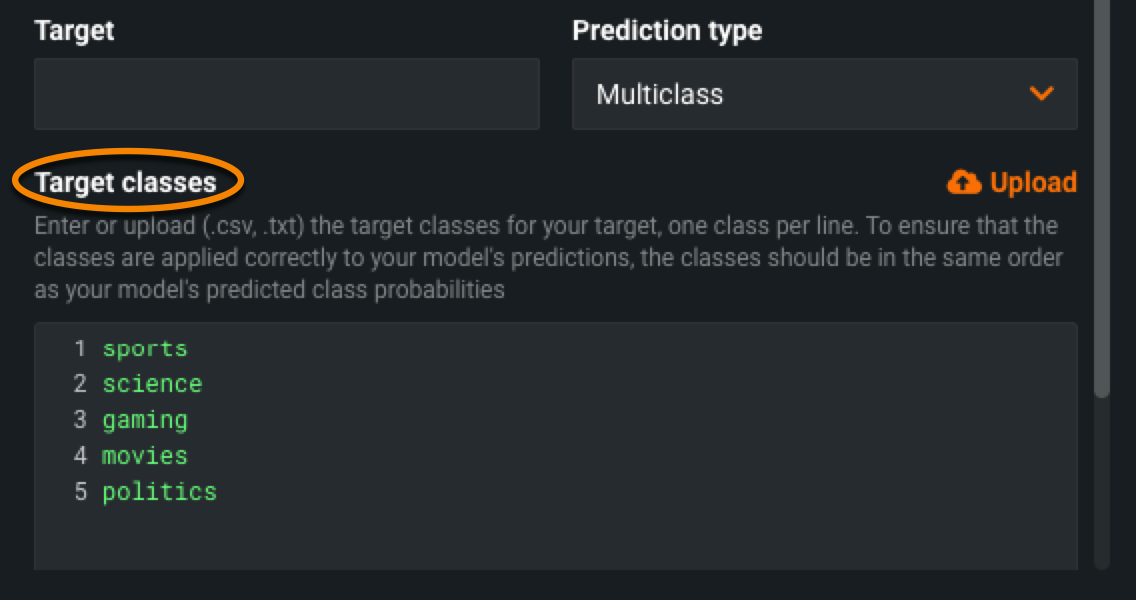Once indicated, via direct text input or via upload of a CSV or TXT file, provide the target classes for your model (one class per line) in the Target classes field: