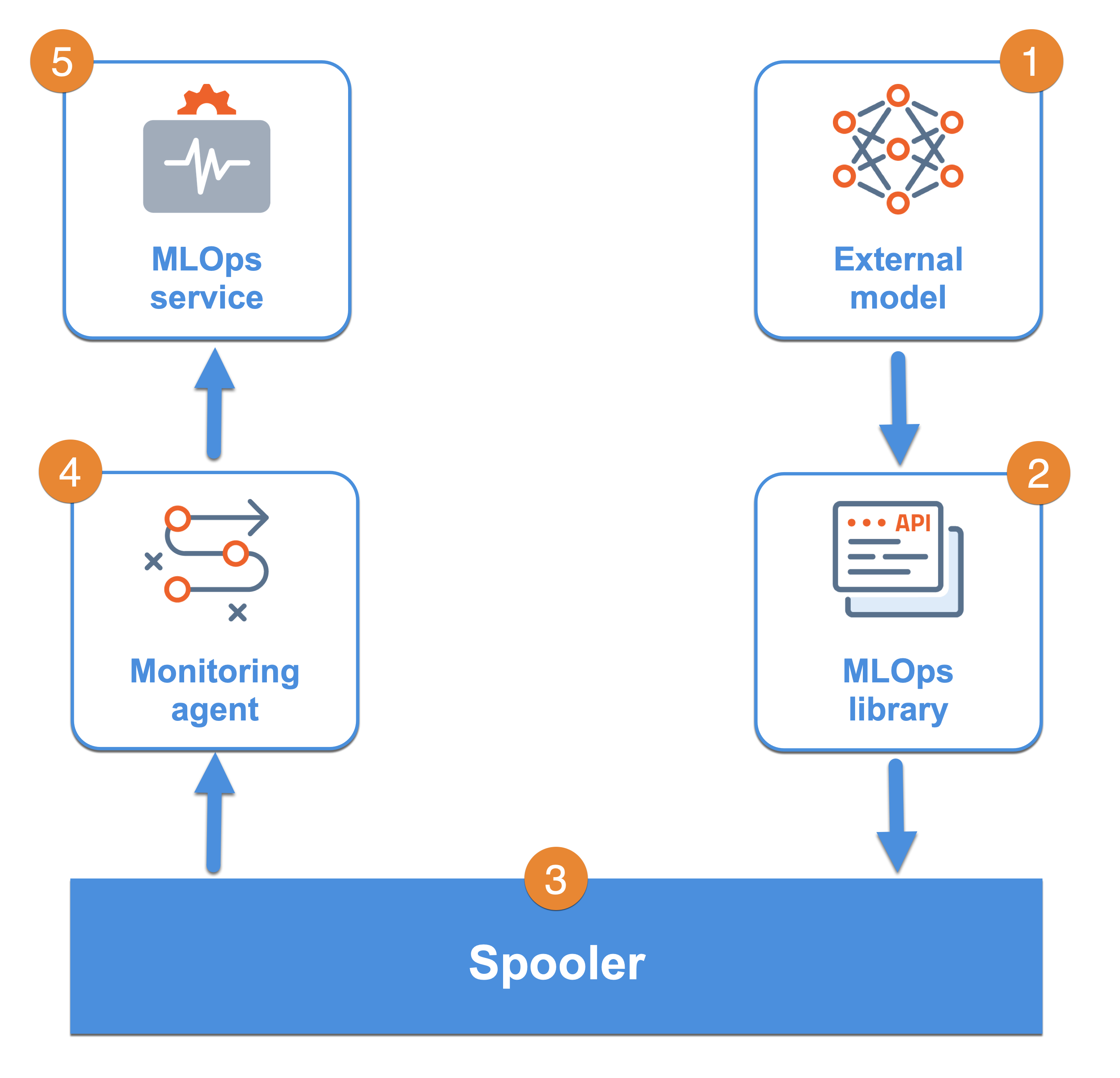 - Use the MLOps library to report metrics from your prediction code, as demonstrated by the snippet. The MLOps library buffers the metrics in a spooler (i.e., Filesystem, Rabbit MQ, Kafka, among others), which enables high throughput without slowing down the deployment.