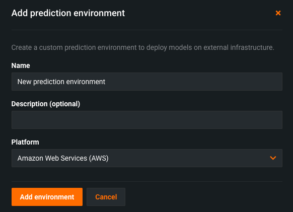 Field Description Name Enter a descriptive prediction environment name. Description (Optional) Enter a description of the external prediction environment. Platform Select the external platform on which the model is running and making predictions. -