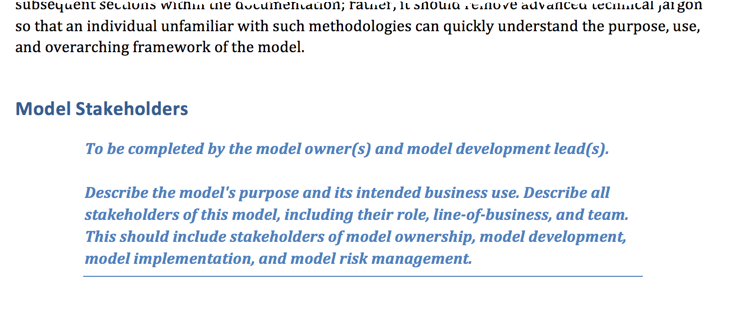 After you have generated the model compliance report, click Download and save the .docx file to your system. Open the file to review and complete the document. Areas of blue italic text are intended as guidance and instruction. They identify who should complete the section and provide detail of the required information.