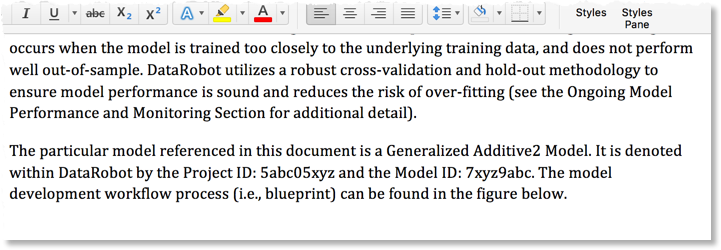 Areas of regular text are DataRobot's automatically generated model compliance text—preprocessing, performance, impact, task-specific, and DataRobot general information.