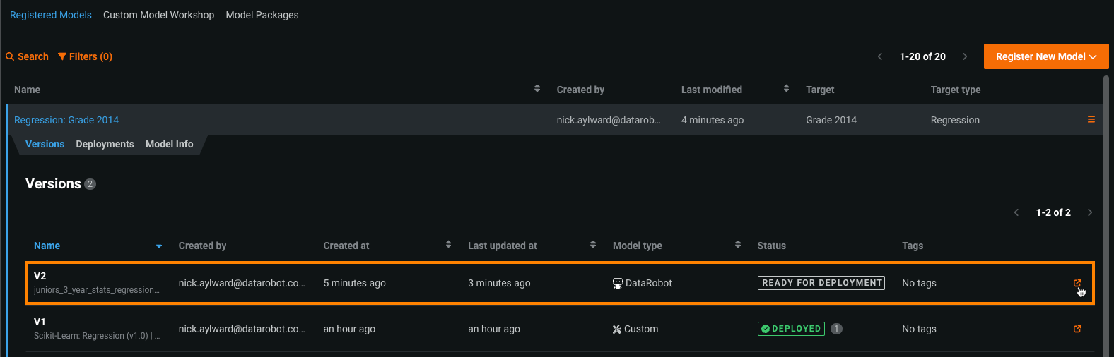 Click Model Registry > Registered Models and select the Scoring Code enabled model you want to deploy to the Snowflake prediction environment.