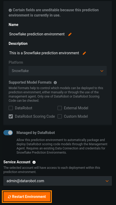 When you update database settings or credentials for the Snowflake data connection used by the prediction environment, you can restart the environment to apply those changes to the environment: