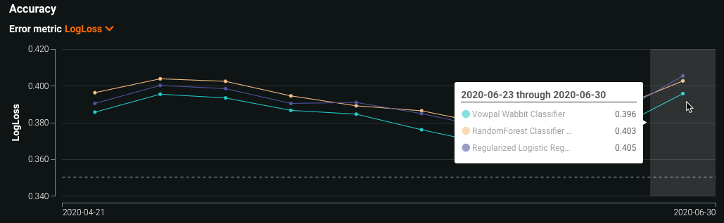 The Accuracy chart records the change in a selected accuracy metric value (LogLoss in this example) over time. These metrics are identical to those used for the evaluation of the model before deployment. Use the dropdown to change the accuracy metric. You can select from any of the supported metrics for the deployment's modeling type.