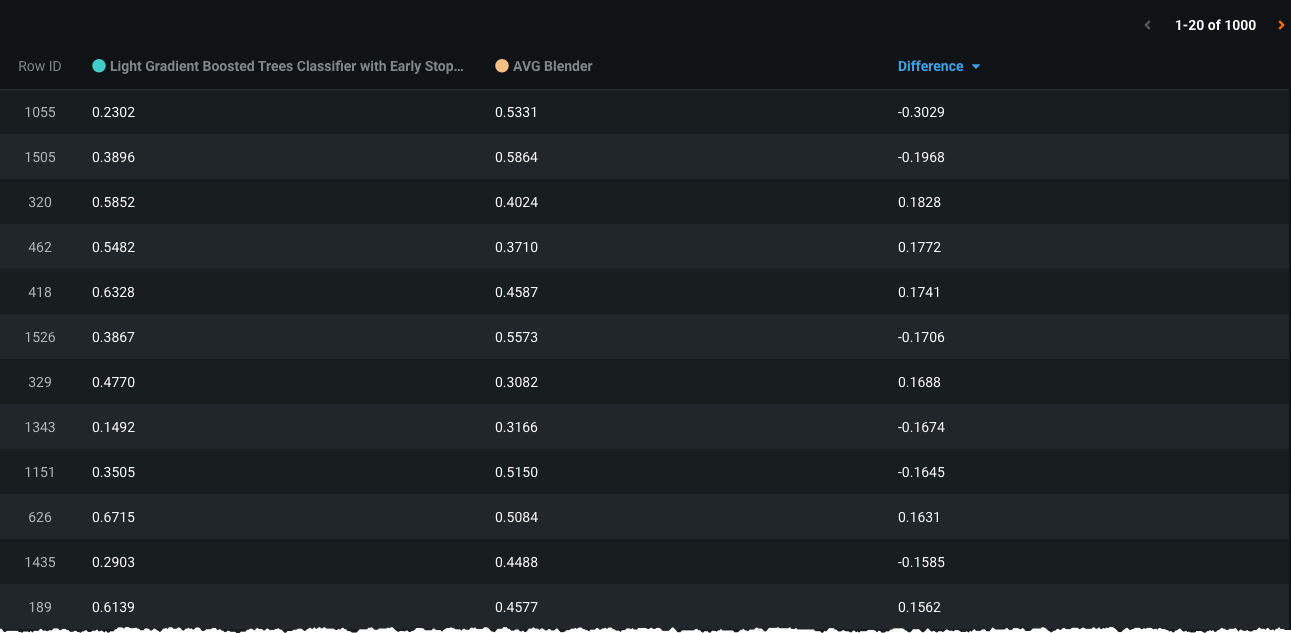 The bottom section of the Predictions Difference tab shows the 1000 most divergent predictions (in terms of absolute value).
