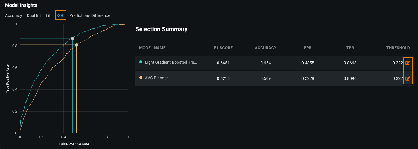 The curves for the two models represented on this chart maintain the color they were assigned when added to the deployment (as either a champion or challenger). You can update the prediction thresholds for the models by clicking the pencil icons.