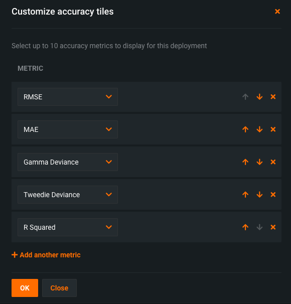 To add a new metric tile, click Add another metric. Each deployment can display up to 10 accuracy tiles.