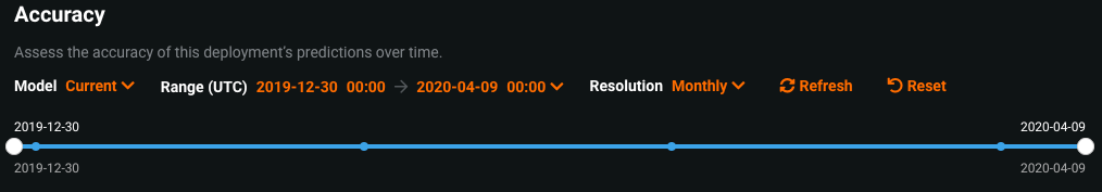 The Accuracy tab allows you to analyze the performance of model deployments over time using standard statistical measures and exportable visualizations.