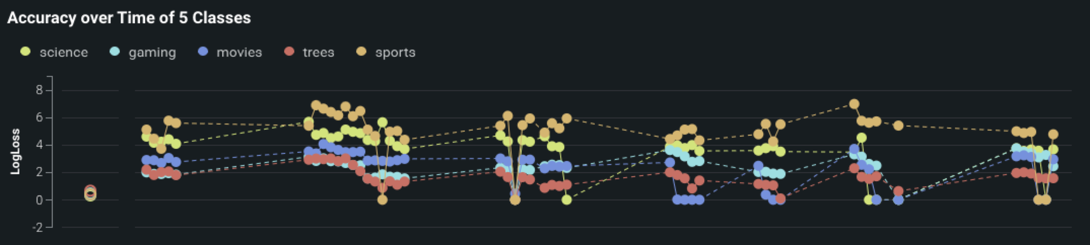 The Accuracy over Time graph displays the change over time for a selected accuracy metric value (LogLoss in this example):