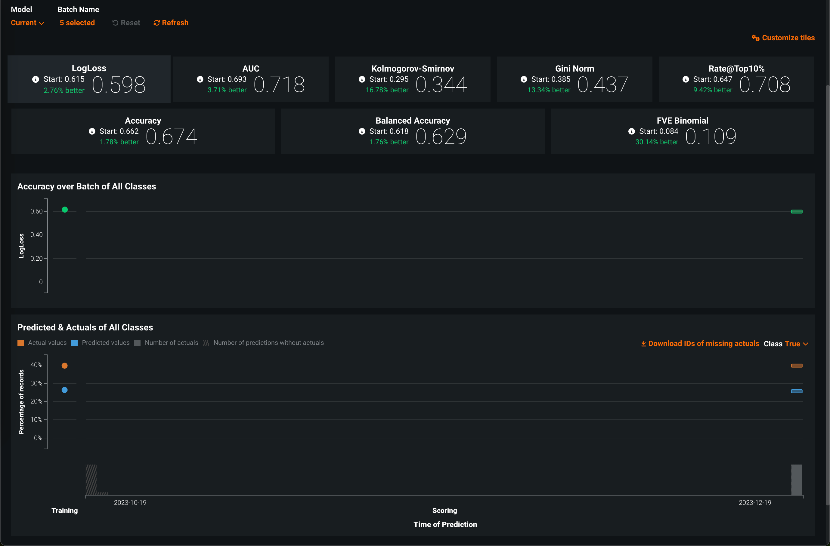 On the Accuracy tab, you can view the accuracy metric values for a batch deployment. You can use the Batch Name selector to determine which batches are included. In addition, to customize the metrics visible on the tab, you can click Customize tiles: