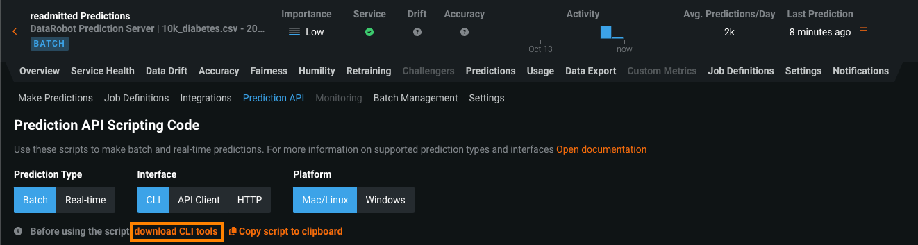 To make batch predictions using the DataRobot command line interface (CLI) for batch predictions, download the CLI tools from the Predictions > Prediction API tab of your deployment. To locate it make sure the Prediction Type is set to Batch and the Interface is set to CLI, then click download CLI tools (or Copy script to clipboard):