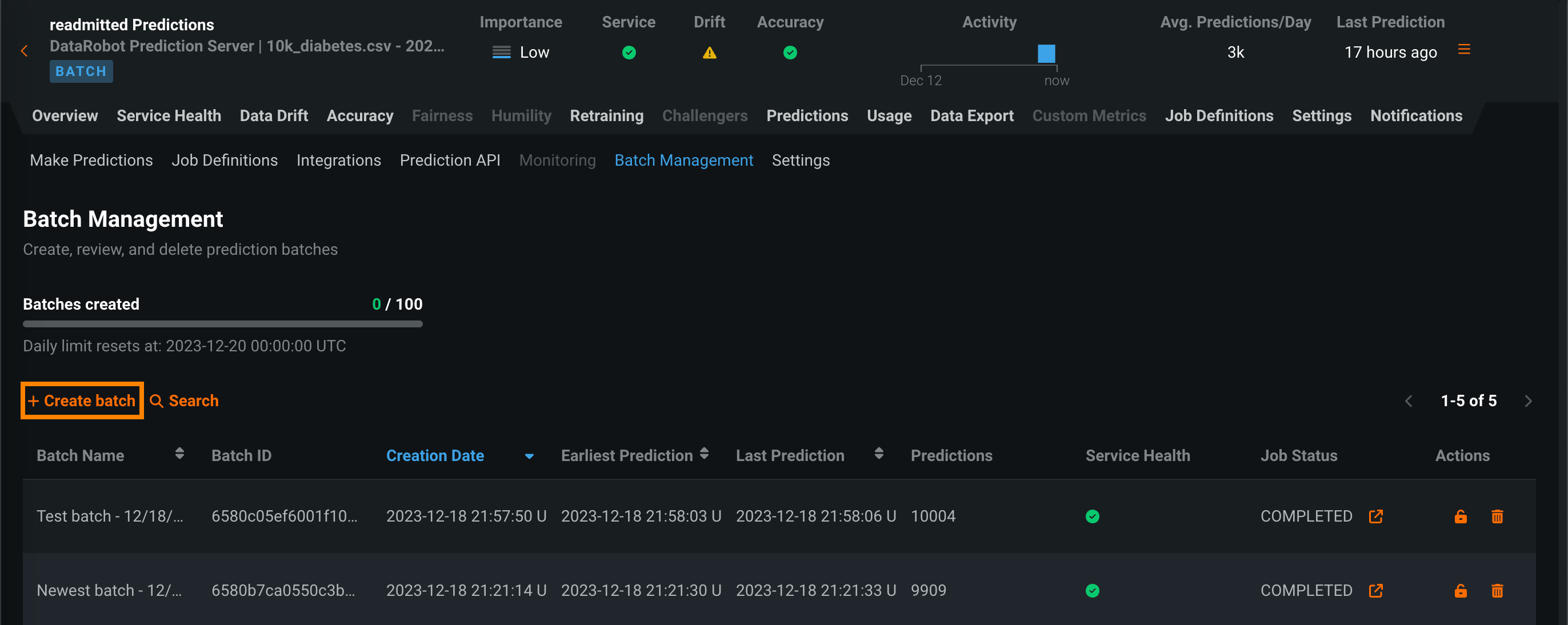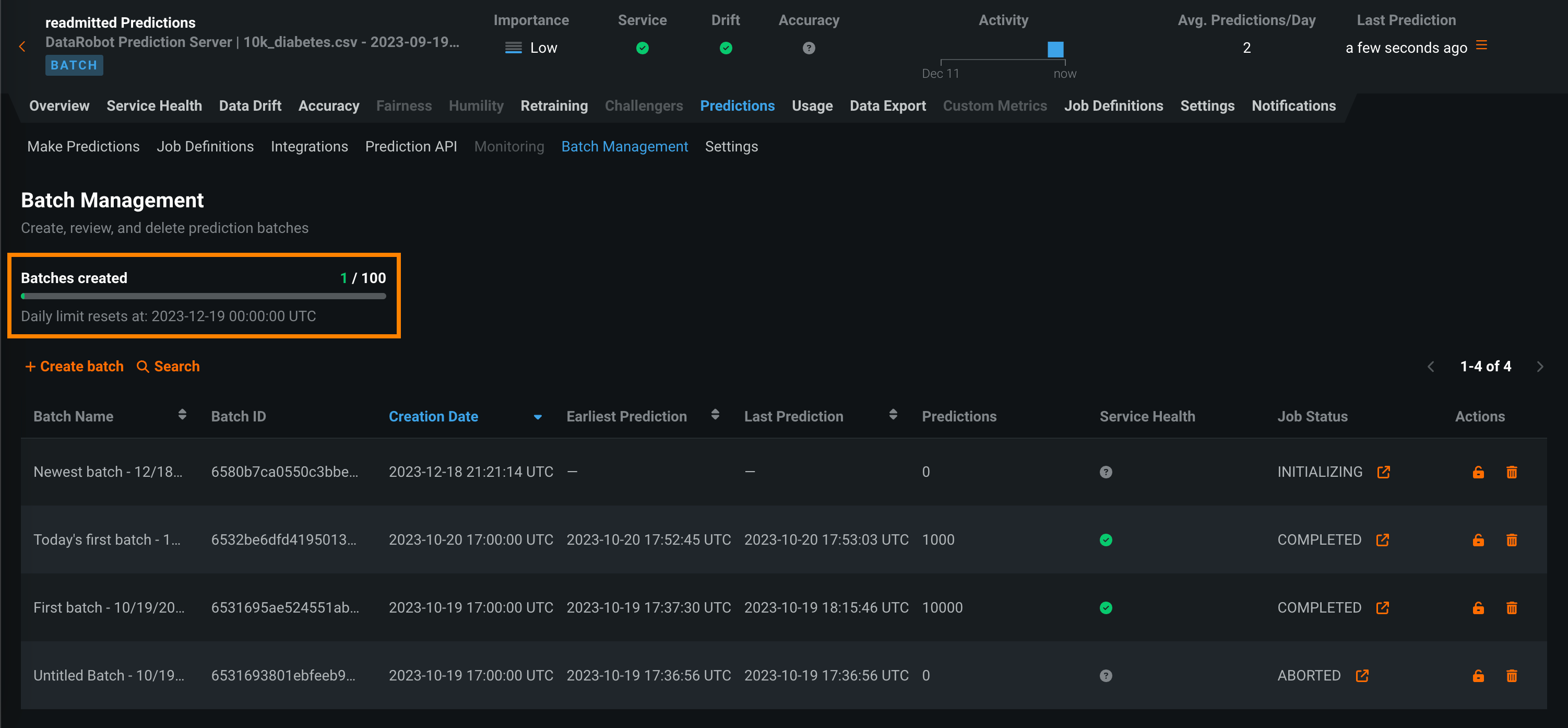 On the Predictions > Batch Management tab, in addition to creating batches, you can perform a number of management actions, and view your progress towards the daily batch creation limit for the current deployment.