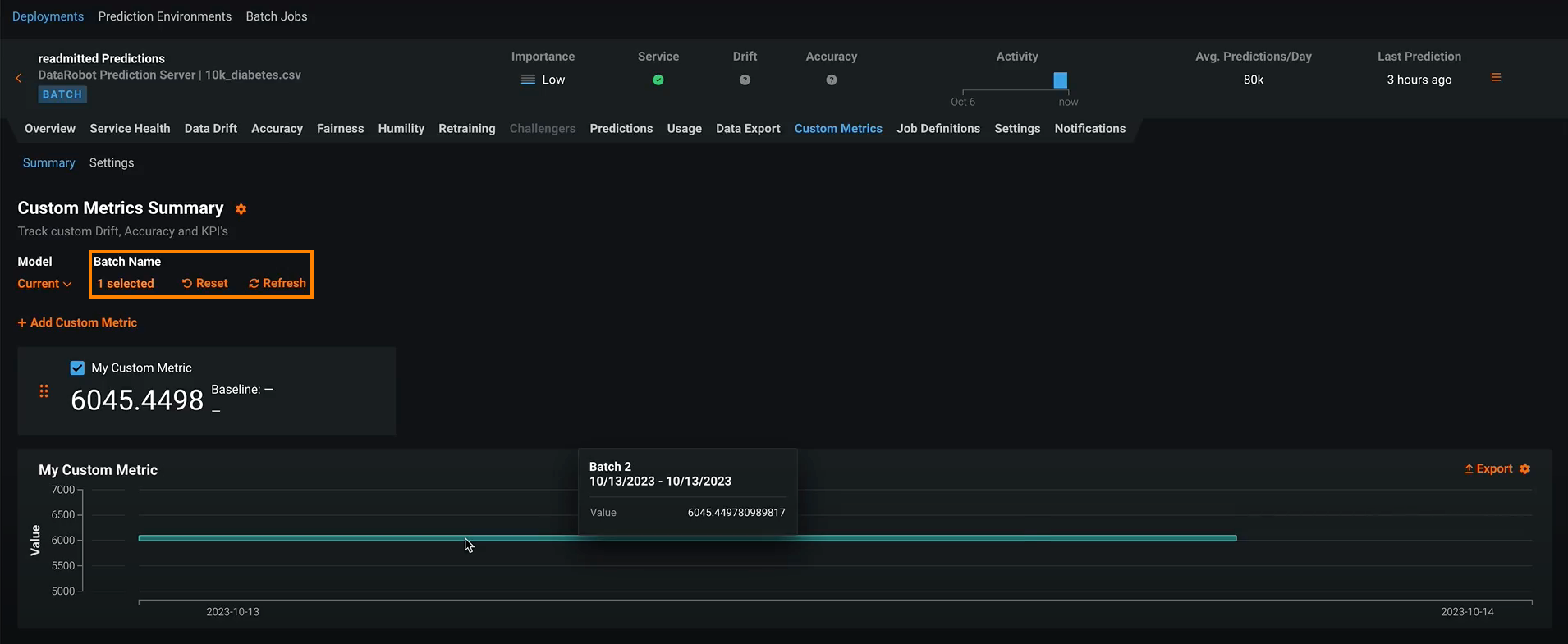 In addition to service health, data drift, and accuracy monitoring, you can configure data exploration and custom metrics for batch deployments. On both of these tabs, you can use the Batch Name selector to determine which batches are included: