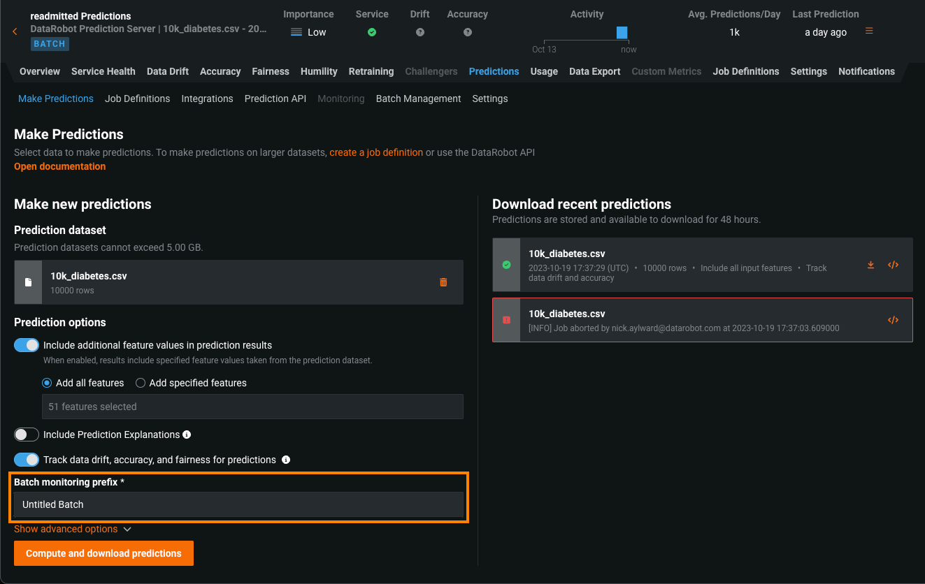 On the Predictions > Make Predictions tab, you can make one-time batch predictions as you would for a standard deployment; however, for batch deployments, you can also configure the Batch monitoring prefix to append to the prediction date and time in the Batch Name on the Batch Management tab: