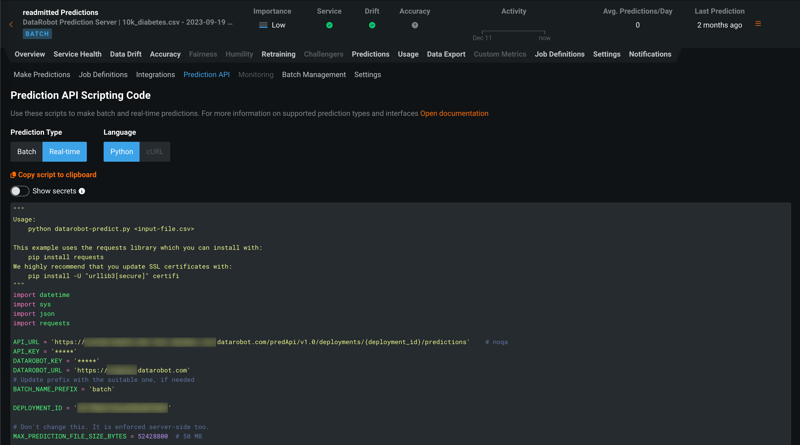 In addition, on the Predictions > Predictions API tab, you can copy and run the Python code snippet to make a DataRobot API request creating a batch on the Batch Management tab and adding predictions to it: