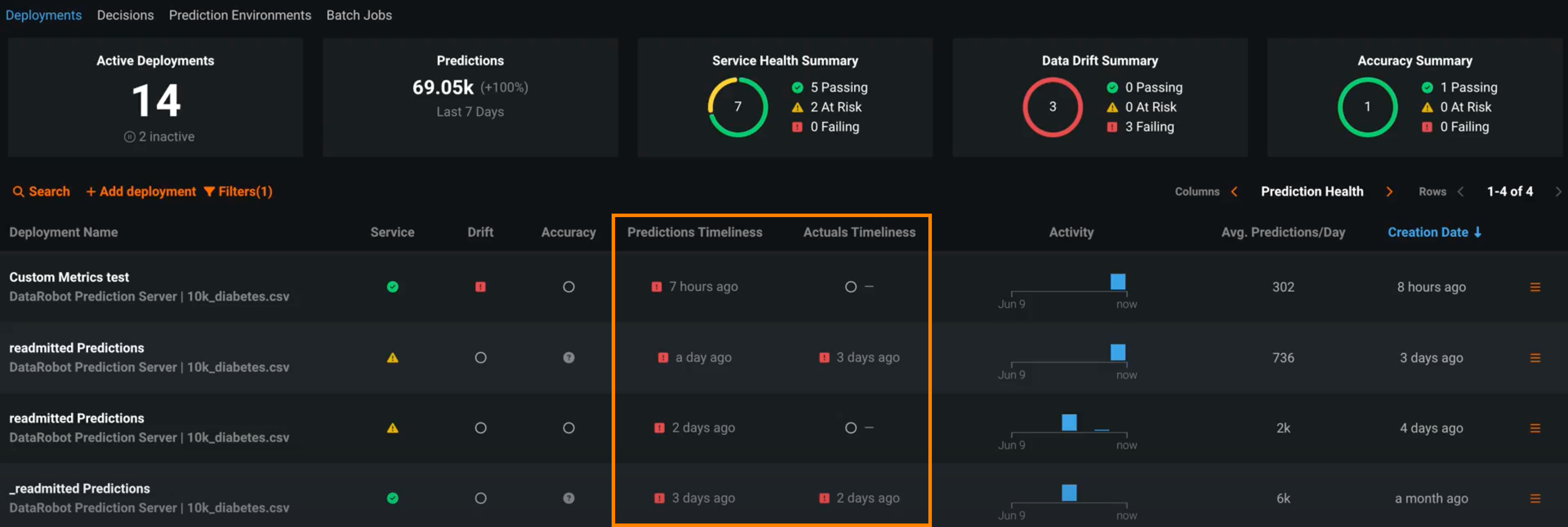 Timeliness indicators can reveal if the prediction or actuals upload frequency meets the standards set by your organization. Deployments have several statuses to define the general health of a deployment, including Service Health, Data Drift, and Accuracy. These statuses are calculated based on the most recent available data. For deployments relying on batch predictions made in intervals greater than 24 hours, this method can result in a Gray / Unknown status on the Prediction Health indicators in the deployment inventory. If timeliness is enabled for a deployment, the health indicators retain the most recently calculated health status, presented along with timeliness status indicators to reveal when they are based on old data. You can determine the appropriate timeliness intervals for your deployments on a case-by-case basis.