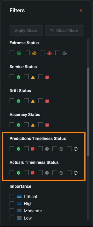In the Deployments inventory, click Filters to apply Predictions Timeliness Status and Actuals Timeliness Status filters by status value: