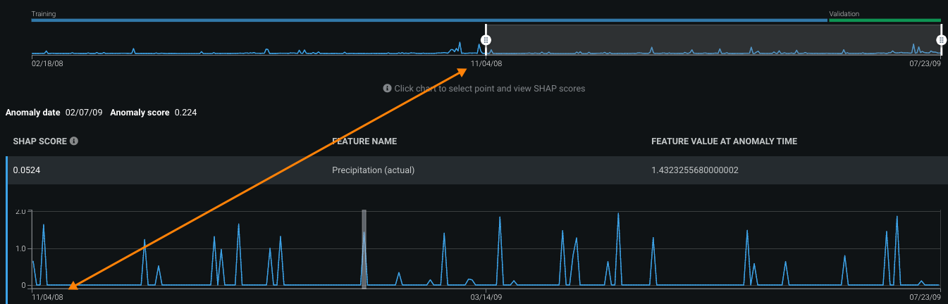 When you open the tab and click to compute the assessment, the most anomalous point in the validation data is selected by default (a white vertical bar) with corresponding explanations below. Hover on any point to see the prediction for that point; click elsewhere in the chart to move the bar. As the bar moves, the explanations below the chart update.