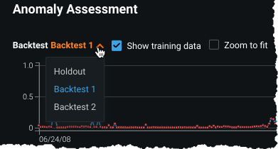 Use the dropdown to select a specific backtest or the holdout partition. The chart updates to include only data from within that date range. For multiseries projects there is an additional dropdown that allows you to select the series of interest.