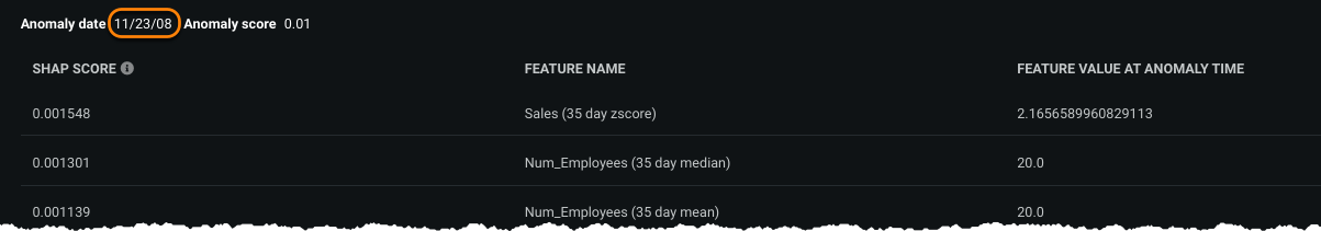 The white vertical bar in the main chart serves as a selector that controls the SHAP explanation display. As you click through the chart, you can notice that the list of explanations (scores) changes. For example, on 11/23/08 the anomaly score was fairly low with a derivation of the feature "Sales" having the most impact: