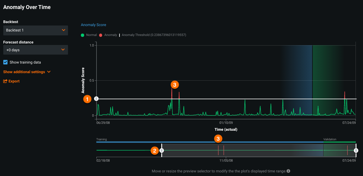 This chart, in addition to handles that control the preview (1), provides an additional handle to control the anomaly threshold (2). Drag the handle up and down to set the threshold that defines whether plot values should be considered as anomalies. Points above the threshold are indicated in red, both in the upper chart and in the preview (3).