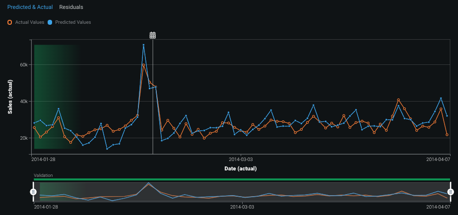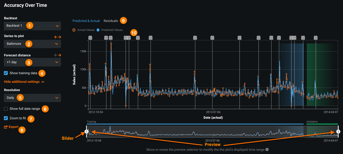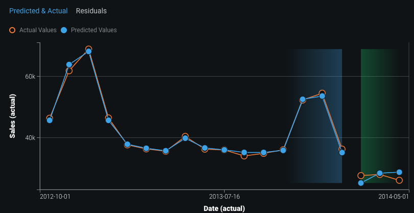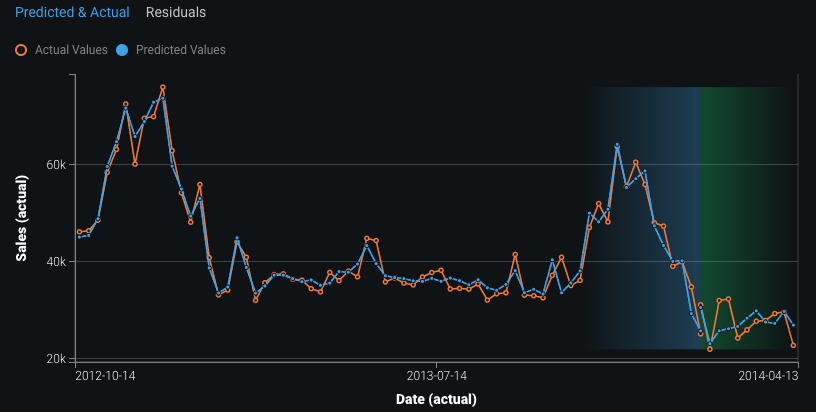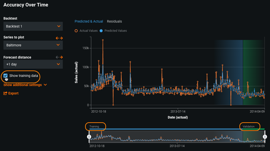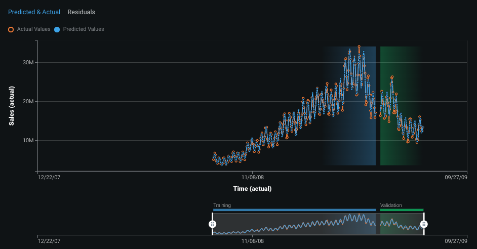 The Predicted & Actual Over Time chart represents the actual values by open orange circles. Predicted values based on the validation set are represented by blue solid circles, which corresponds to the blue in the backtest representation. You can additionally compute and include predictions on the training data for each backtest. The bar below the chart indicates the division between training and validation data.