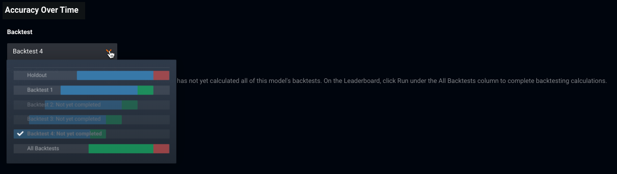 DataRobot initially computes and displays data for Backtest 1. To display values for all computed backtests, select All Backtests from the Backtest dropdown. You can either compute each backtest individually from the dropdown, or, to compute all backtests at once, click the Run button for the model on the Leaderboard.
