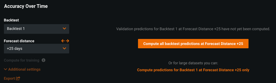 When working with large (downsampled) datasets or projects with wide forecast windows, DataRobot computes Accuracy Over Time on-demand, allowing you to specify the forecast distance of interest. For each distance you navigate to on the chart, you are prompted to compute the results and view the insight. In this way, you can determine the number of distances to check in order to confidently deploy models into production, without overburdening compute resources.